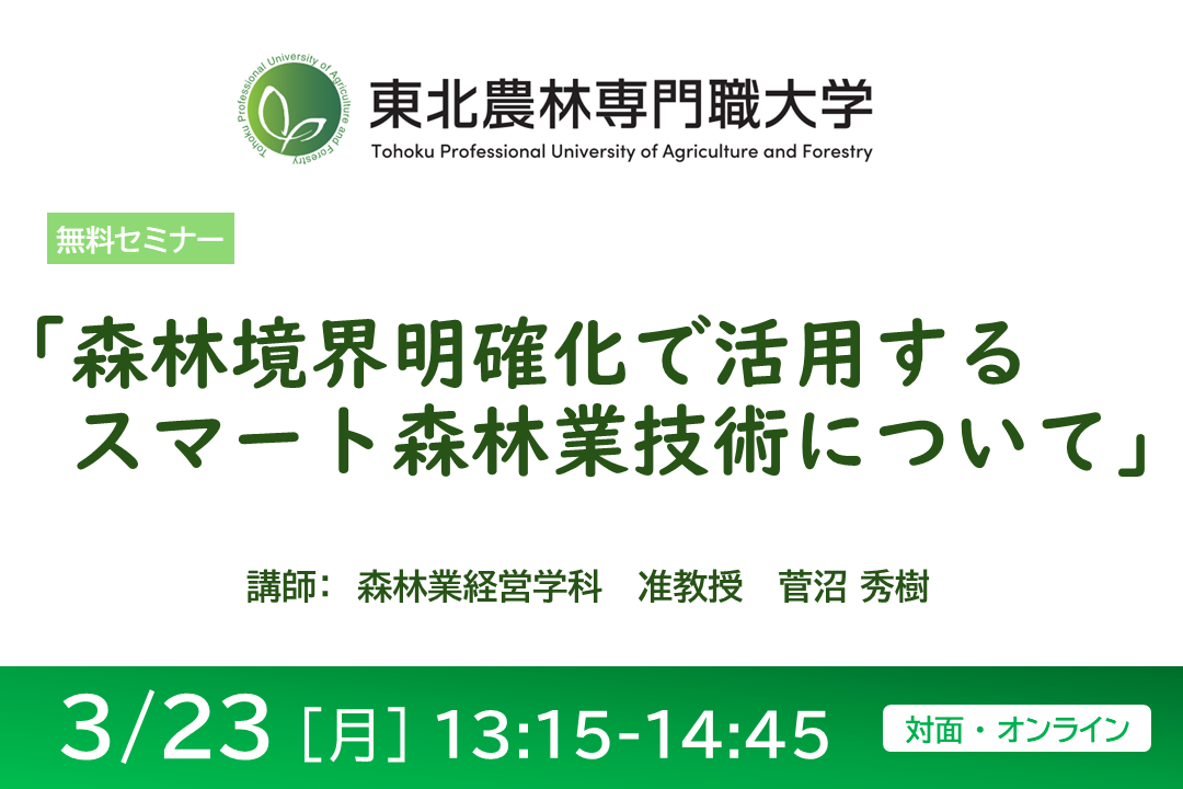 東北農林専門職大学では、スマート森林業の推進を図ることを目的として、本学教員によるセミナーを開催します。